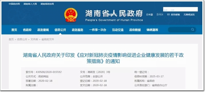 2月18日,湖南省委辦公廳、省政府辦公廳聯合印發《應對新冠肺炎疫情影響促進企業健康發展的若干政策措施》的通知: