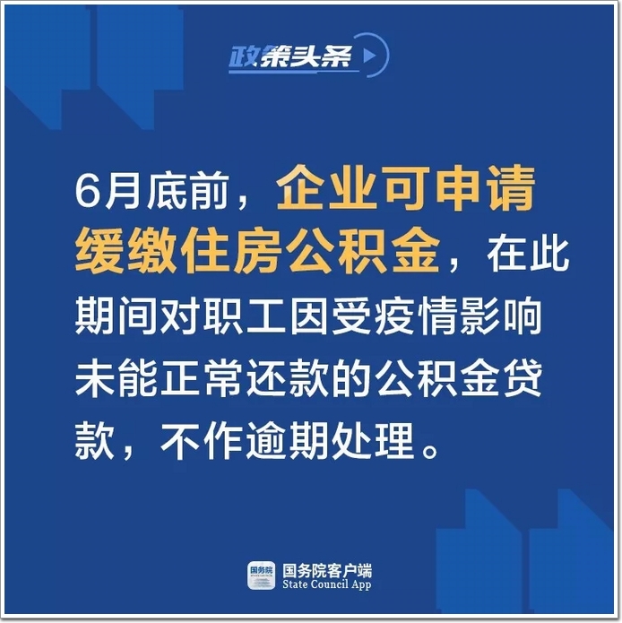 2、6月底前,企業可申請緩繳住房公積金。期間受疫情影響未正常還款的,不作逾期處理。
