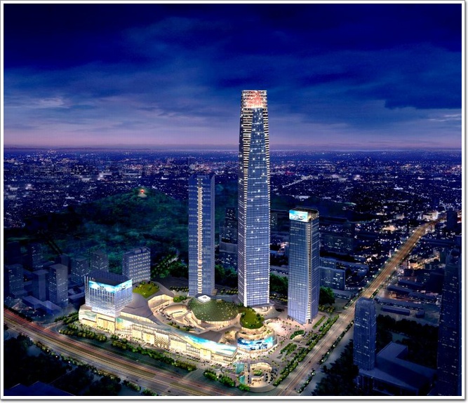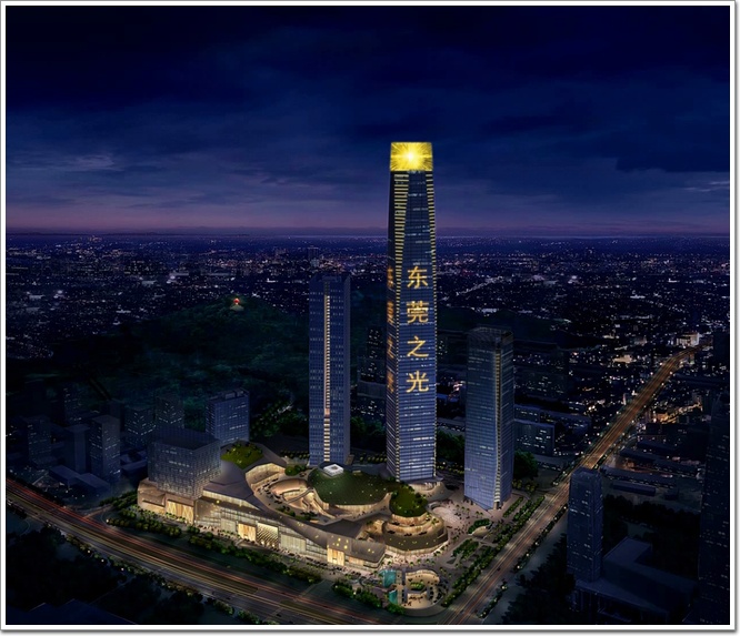 東莞國貿(mào)中心整體規(guī)劃設計由美國5+Design及深圳華森設計共同擔綱,承建商是中建五局,幕墻工程由深圳市三鑫科技發(fā)展有限公司打造。項目地處東莞市核心CBD地段,緊鄰東莞大道與鴻福路,總建筑面積達108萬平方米,由5棟塔樓、裙樓及4層地下室組成,其中作為主體建筑的2號樓高達423米,共85層,是目前東莞最高的地標建筑。