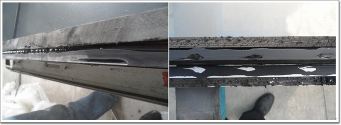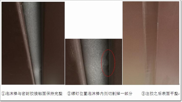 對于此類起泡問題,解決的方案為:盡量讓與密封膠接觸一面的泡沫棒保持完整,如不好填塞,可以把泡沫棒背面切割掉一部分。特別是在膠縫過淺或者螺釘比較靠外的膠縫,可以將整條泡沫棒或者對應(yīng)于螺釘位置泡沫棒切割掉一部分,讓泡沫棒破損面朝內(nèi)或朝向螺釘,完整面朝向密封膠,注意破損面不能接觸密封膠,并保持膠縫深度基本一致。按上述方法施工可以比較好地解決此類起泡問題。