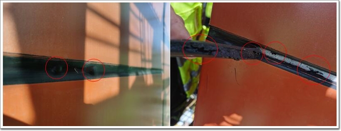根據(jù)相關(guān)工程案例的經(jīng)驗,隨機出現(xiàn)的單個起泡多為密封膠注膠過程中裹入,因此出現(xiàn)的位置沒有規(guī)律。出現(xiàn)的原因可能是注膠不飽滿、膠嘴移動過快或者膠嘴尺寸與膠縫尺寸不匹配。解決的方案為注膠時注意連續(xù)、均勻、飽滿,勿裹入氣泡,同時注意膠嘴尺寸與膠縫尺寸相匹配,以膠嘴能伸入膠縫至少二分之一的深度為宜。