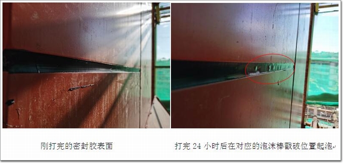 根據(jù)相關(guān)工程案例的經(jīng)驗,此類起泡問題的原因是泡沫棒在填塞過程中表面被戳破,或者在某些位置被截斷,注膠后泡沫棒在破孔處或截斷處放氣,導(dǎo)致出現(xiàn)起泡。