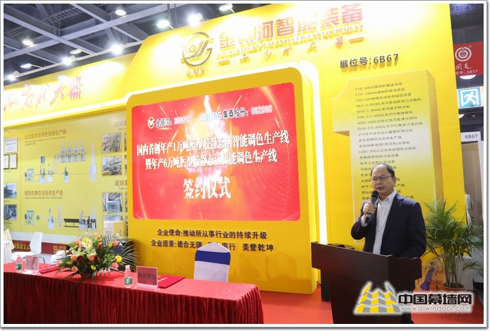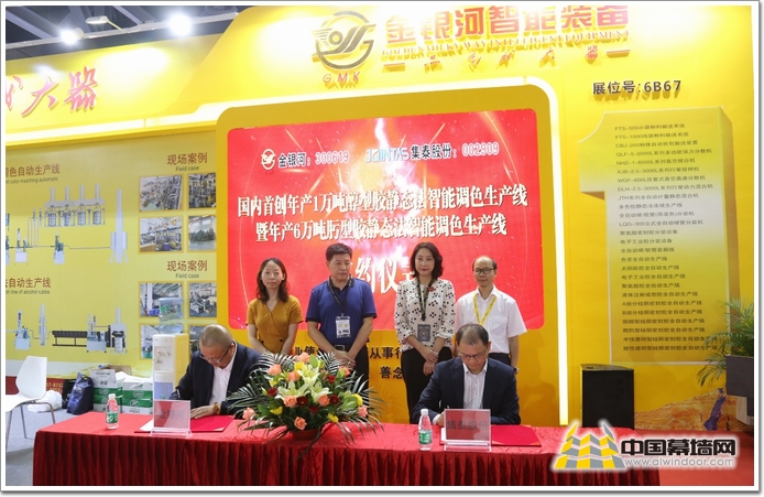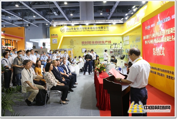 智能化科技項目,轉化成先進生產力|2020年8月13日,在全國,以及全行業,整個產業鏈凝心聚力,共同抗疫,取得復工復產的階段性勝利的今天,建筑門窗幕墻行業及密封膠產業的精英們相聚廣州,在2020年第26屆全國鋁門窗幕墻新產品博覽會現場,舉行“國內首創年產1萬噸醇型膠靜態法智能調色生產線暨年產6萬噸肟型膠靜態法智能調色生產線簽約”儀式。