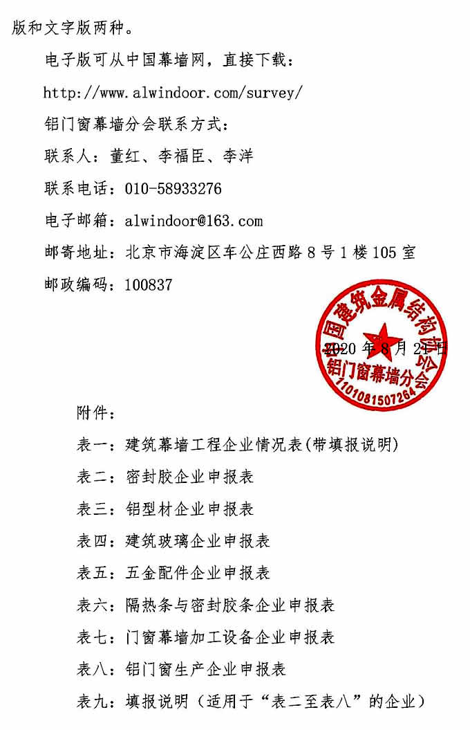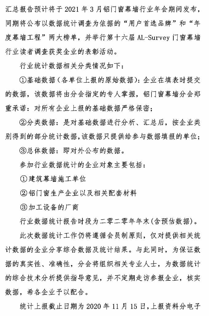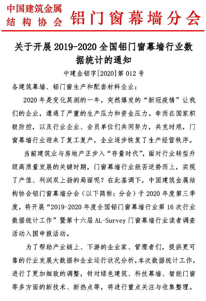 關(guān)于開(kāi)展2019-2020全國(guó)鋁門(mén)窗(詞條“門(mén)窗”由行業(yè)大百科提供)幕墻行業(yè)數(shù)據(jù)統(tǒng)計(jì)的通知