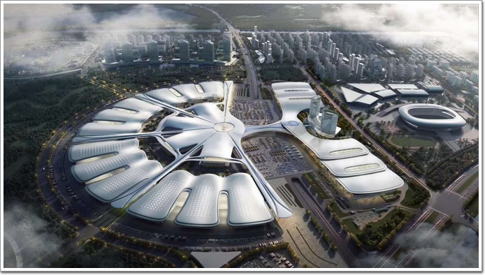 淮海國際博覽中心項(xiàng)目設(shè)計(jì)獨(dú)具匠心,以古城徐州“五省通衢”獨(dú)特的地理區(qū)位,將雄鷹振翅翱翔的形態(tài)理念融入設(shè)計(jì)之中,設(shè)有“一軸·兩翼·三區(qū)”,一軸貫通——串聯(lián)會(huì)展博覽中心和奧體中心,打造城市客廳,塑造都市活力門戶;雙翼延展——兩翼呼應(yīng)徐州兩漢文化;三區(qū)協(xié)同——打造國際會(huì)展博覽區(qū)、商旅樂活休閑區(qū)、商貿(mào)傳媒聚集區(qū)。