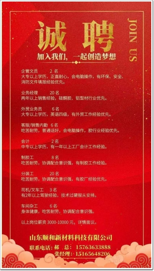 面對嶄新的2021年,順和膠業將矢志不渝地打造“順和”高精尖的品牌形象,繼續加大宣傳推廣,積極做好人才引進和培養,努力做好技術創新和應用,大力促進國際化發展的產業布局,為實現順和新材料的全面提升而不斷前行。在大展鴻圖、突飛猛進、勇往直前之際,順和膠業現面向社會誠招各類英才——夢想舞臺,邀您來戰!