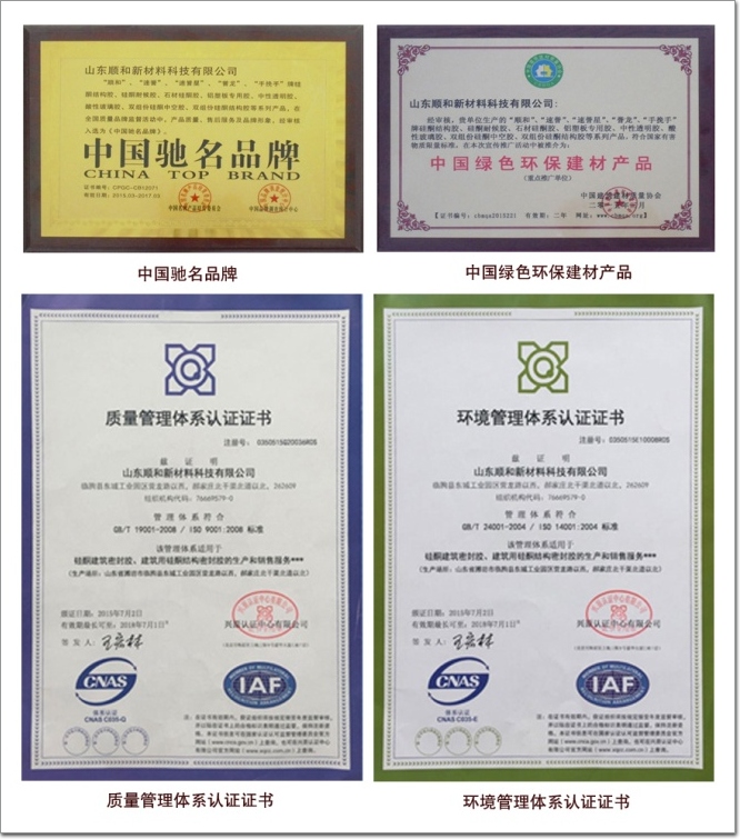 順和膠業以經濟實力為后盾,以技術力量為指導,以科學的管理制度為方針,不僅產品已達到ISO9001:2008國際質量管理體系認證標準和ISO14001環境管理體系認證,還榮獲“中國馳名品牌”、“中國綠色建材產品”等稱號,同時,還通過建筑行業權威部門(詞條“門”由行業大百科提供)中國建筑金屬結構協會鋁門窗幕墻分會與中國建筑裝飾協會幕墻工程分會的認定與推薦,成功取得“建筑用硅酮結構密封膠生產推薦企業”稱號。