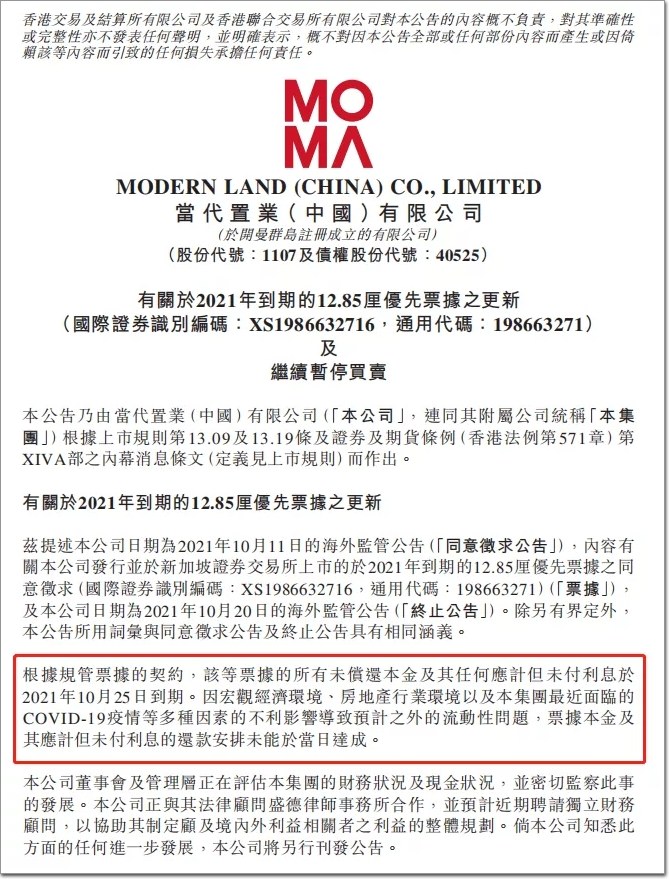 2021年10月26日,當(dāng)代置業(yè)發(fā)布公告稱(chēng),公司于10月25日到期的12.85厘優(yōu)先票據(jù),未能按時(shí)償還票據(jù)本金及其應(yīng)計(jì)但未付利息。這筆資金規(guī)模2.5億美元的票據(jù),是目前當(dāng)代置業(yè)5只存續(xù)美元債中規(guī)模最大的。