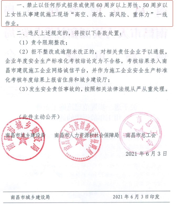 6月11日,南昌市城鄉(xiāng)建設(shè)局發(fā)布了關(guān)于進(jìn)一步規(guī)范建筑施工企業(yè)用工年齡管理的通知,通知明確: