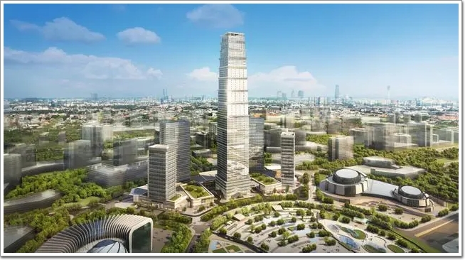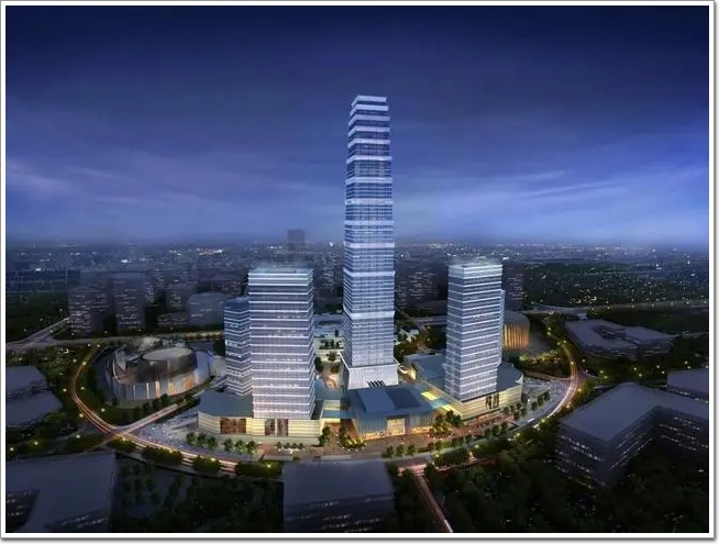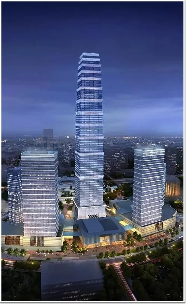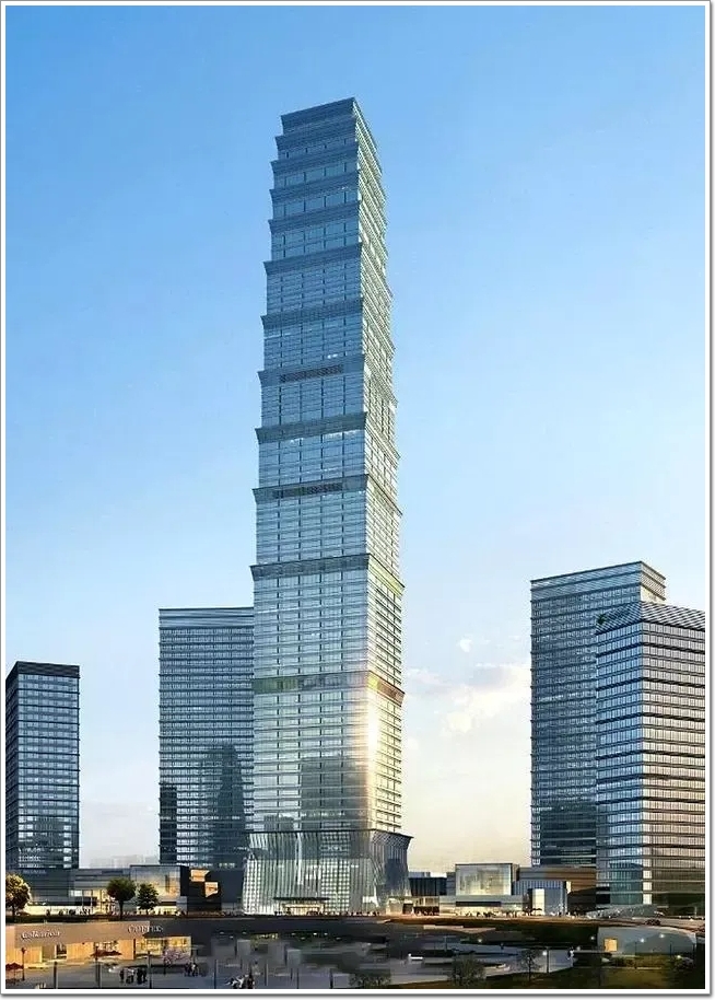 303米高的主塔樓呈節節高造型,這一設計理念源自中國古塔,上小下大,逐節加寬,圓潤敦厚,巍峨神奇。建筑師力求一種現代超高建筑與中國歷史建筑文脈相沿襲的模式。在整體項目布局上,設計也融入了一核兩帶三江五岳七彩的理念,以主塔為核心,兩條規劃路將基地劃為三塊,通過流動空間打造一座三江源城市綜合體。