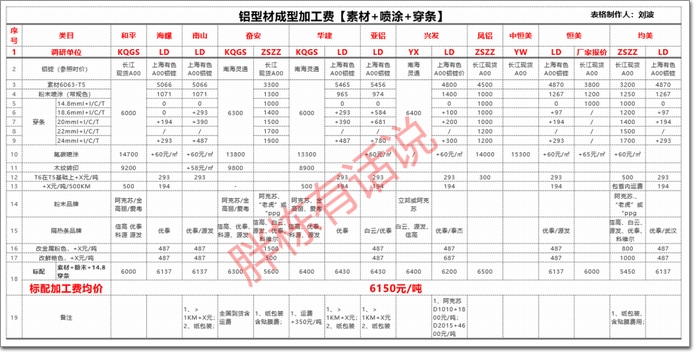 d、舉例(設風險系數):投標時按照2021年2月6日的“長江有色金屬網長江現貨A00鋁錠均價”的價格15480元/t作為鋁錠基價,開工令下發當日“長江有色金屬網長江現貨A00鋁錠均價”的價格Y元/t及數量A噸進行調價,則【漲價】調差為=(訂單采購會簽當日價格Y-15480*(1+X%))*采購日型材數量A。則【降價】調差為=(訂單采購會簽當日價格Y-15480*(1-X%))*采購日型材數量A。(風險系數可設置為3%-5%,相對較公平)