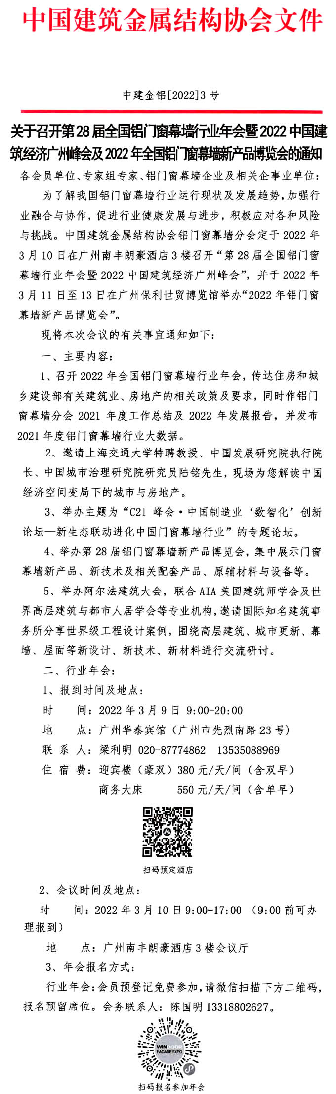 為了解我國鋁門窗幕墻行業運行現狀及發展趨勢,加強行業融合與協作,促進行業健康發展與進步,積極應對各種風險與挑戰。中國建筑金屬結構協會鋁門窗幕墻分會定于2022年3月10日在廣州南豐朗豪酒店3樓召開“第28屆全國鋁門窗幕墻行業年會暨2022中國建筑經濟廣州峰會”,并于2022年3月11日至13日在廣州保利世貿博覽館舉辦“2022年鋁門窗幕墻新產品博覽會”。