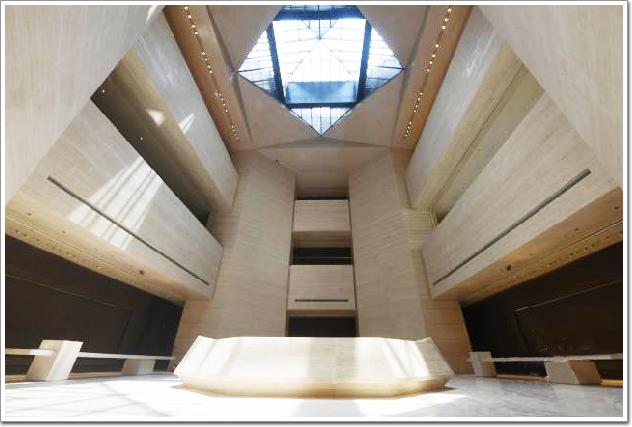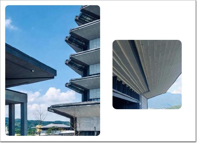 主樓以黑色石材做屋面,灰色石材(芝麻灰)做立面,保留了嶺南本土建筑特點。為呼應(yīng)屋面和立面設(shè)計,吊頂采用一明一暗的鋁板(詞條“鋁板”由行業(yè)大百科提供)造型進行有效填充。