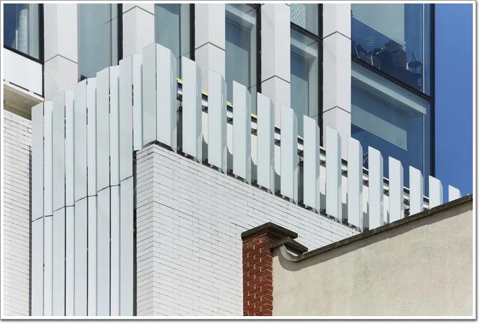 建筑的上部立面與外部通風井垂直連接,通風井選用了富有質感的琺瑯材質,并最終形成鋸齒狀的建筑外觀,這種外觀效果宛如鋼琴的琴鍵,進一步彰顯出建筑的用途。