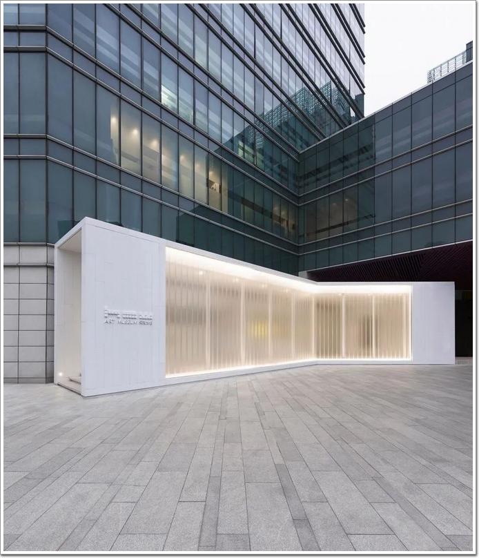 位于上海浦東新區張江高科園區的昊美術館,門廳外立面材料以超白U型半透玻璃與白色琺瑯鋼板相結合。