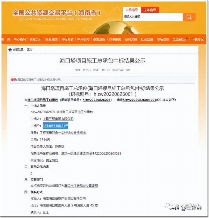 近日,中國幕墻網(wǎng)ALwindoor.com發(fā)現(xiàn)在全國公共資源交易平臺上,公示了海口塔項目施工總承包中標結果,停工三年多的海口塔總承包招標結果公布:中建三局以33.65億中標,較招標控制價(最高限價)低了約3.01億元,計劃工期為1734天。