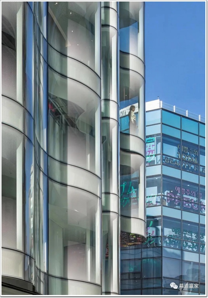 所謂的Cool Jacket立面(4,700平方米)由1,100個(gè)半透明玻璃管組成,高達(dá)6米,這些玻璃管是利用重力彎曲工藝在330毫米的狹小半徑內(nèi)制造的。