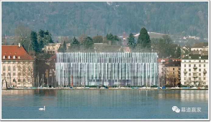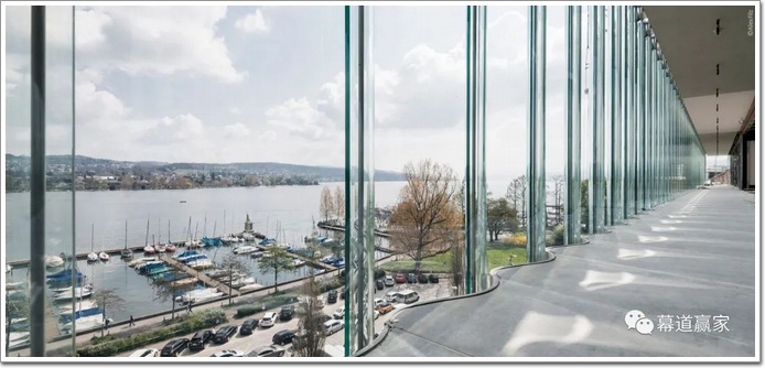 這座光線充足的建筑的六層樓毫不費(fèi)力地與蘇黎世湖下游盆地突出的湖濱融為一體。起伏的玻璃與湖水的波浪相協(xié)調(diào),而其柔和的線條和相關(guān)的光影效果打破了材料的剛性表面。