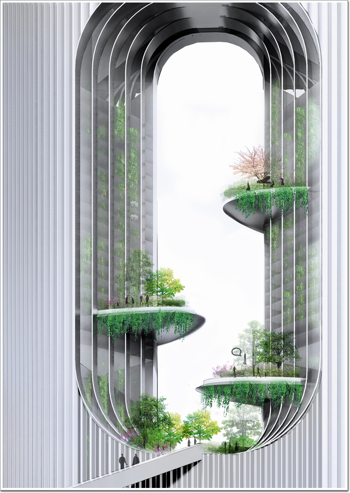銀與綠。整體項目呈現簡潔現代的銀白色,與深超總未來城市的風格契合。巨大的綠色窗口,形成綠廊上一個立體的節點,適宜南方氣候的植物和垂藤從地面逐漸升起,成為漂浮平臺上的綠洲。為辦公人群提供海風拂面的休憩交流空間,屋頂的空中熱帶雨林成為綠色的制高點。