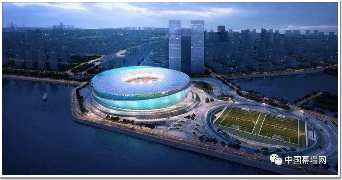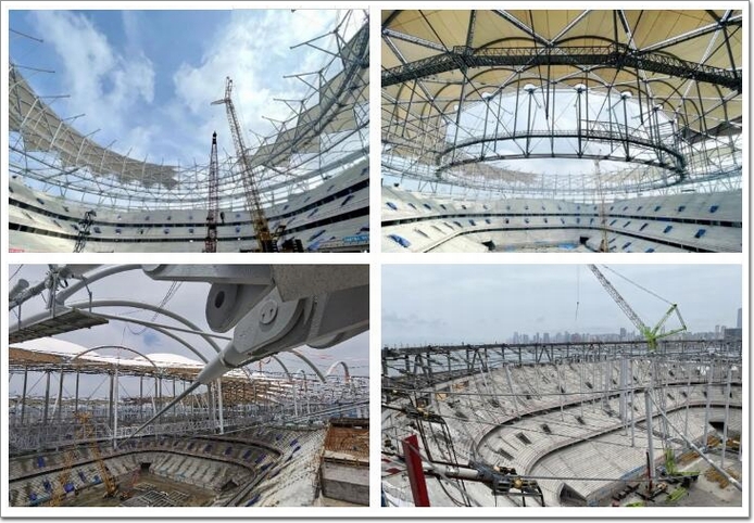 同時,采用大跨度大開口的空間結構形式,斜交索網配合拱桿建筑,可塑造出具有層次感的屋面造型。如今,全部膜材的安裝施工預計8月底可以完成。屆時,足球場整個屋面波浪起伏的設計理念可完美呈現。