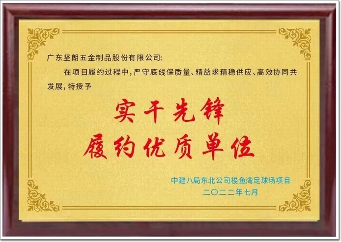 2022年7月18日,在如火如荼的大連梭魚灣足球場建設工地上,中建八局東北公司隆重舉行“百日會戰啟動大會”。堅朗五金作為優質供應商受邀參會,并榮獲“實干先鋒 履約優質單位”。