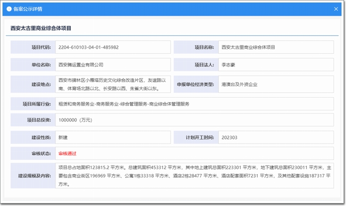 本次招標主體為西安騰運置業有限公司,西安騰運置業有限公司成立于今年3月份,股東為騰運有限公司(太古)和 西安城桓文化投資發展有限公司 (曲江管委會)。