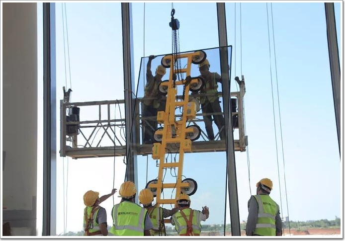 ③用中空(詞條“中空”由行業(yè)大百科提供)吸盤將玻璃板塊運到安裝位置,隨后將玻璃板塊由上向下輕輕放在玻璃墊塊上,使板塊的左右中心線與分格的中心線保持一致;