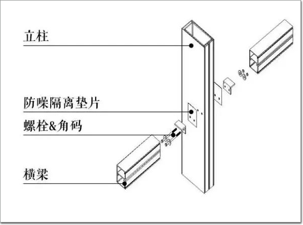 ④橫梁上下表面與立柱正面應成直角,嚴禁向下傾斜,若發(fā)生此種現(xiàn)象應采用自攻釘將角鋁塊直接固定在立柱上,以增強橫梁抵抗扭矩的能力。