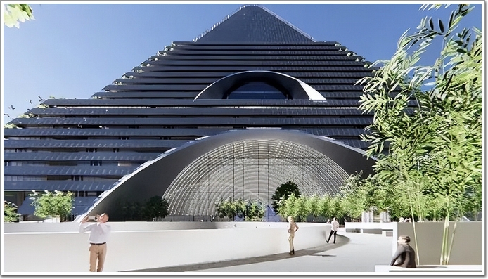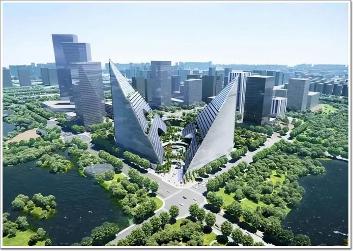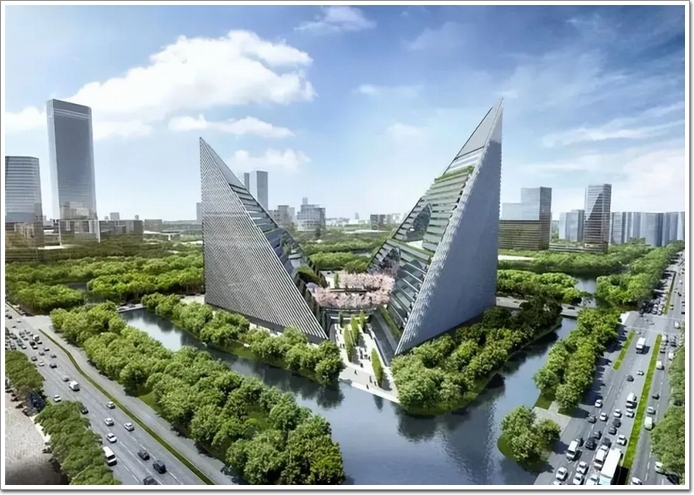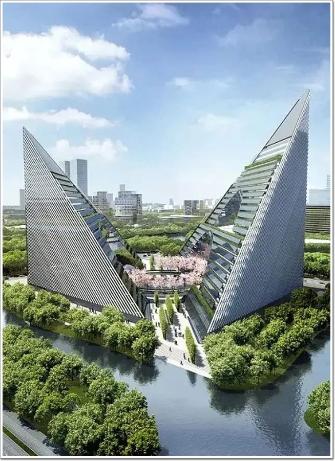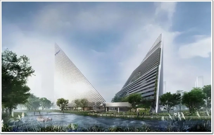 研發(fā)中心的2幢三角幾何形塔樓——分別高159.75米和134.65米,建筑師借用重力法則,探索在垂直建筑空間里的城市場(chǎng)所營(yíng)造。一條城市空間廊道斜穿場(chǎng)地,兩個(gè)三角塔樓分居兩側(cè),形成一個(gè)山谷“V”型格局。