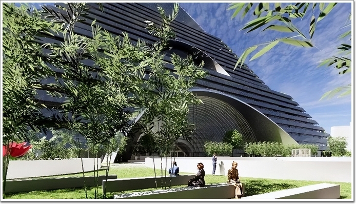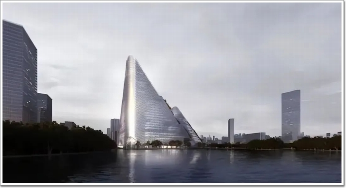 三角形的體量將大尺度開(kāi)放空間和公共功能沉淀于擴(kuò)大的底層,同時(shí)把其它較小型開(kāi)放空間提升到擁有開(kāi)闊視野的高空,并且利用傾斜的體型為各層提供通常在高層建筑里少有的戶外平臺(tái)。建筑和周邊水網(wǎng)共同構(gòu)成一幅山水圖景,為未來(lái)感的建筑增添一份詩(shī)意。