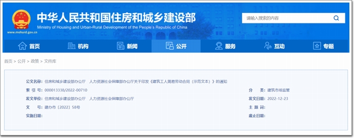 2022年12月30日,住建部和人社部聯(lián)合發(fā)布關(guān)于印發(fā)《建筑工人簡易勞動合同(示范文本)》的通知,供建筑企業(yè)和建筑工人簽訂勞動合同時參考。