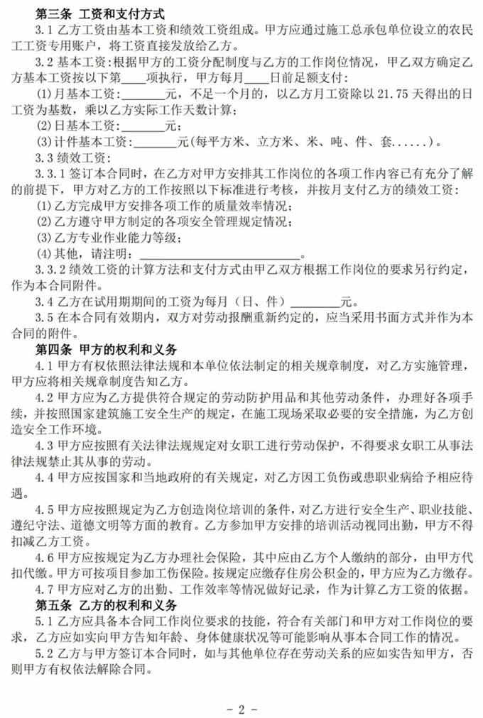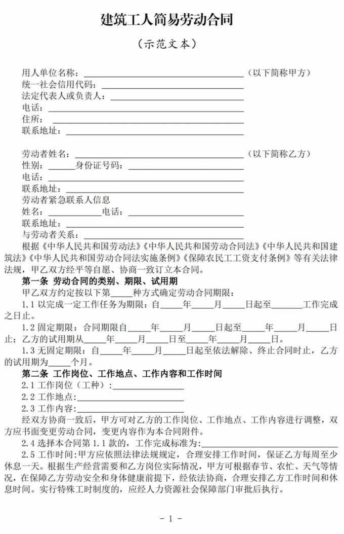 為規(guī)范建筑用工管理,保障建筑工人合法權(quán)益,更好地為建筑企業(yè)和建筑工人簽訂勞動合同提供指導(dǎo)服務(wù),住房和城鄉(xiāng)建設(shè)部、人力資源社會保障部根據(jù)《中華人民共和國勞動法》《中華人民共和國勞動合同法》《中華人民共和國建筑法》《中華人民共和國勞動合同法實施條例》《保障農(nóng)民工工資支付條例》等法律法規(guī)及有關(guān)政策規(guī)定,制定了《建筑工人簡易勞動合同(示范文本)》,F(xiàn)印發(fā)給你們,供建筑企業(yè)和建筑工人簽訂勞動合同時參考。