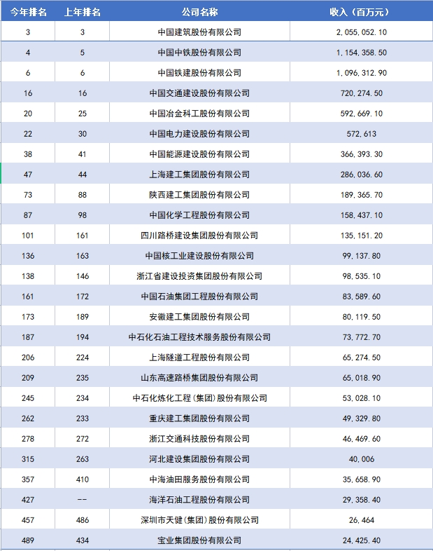 此外,中國建筑股份有限公司、中國鐵建股份有限公司、中國交通建設股份有限公司與去年排名持平,其中中國建筑連續十一年位列第三名。
