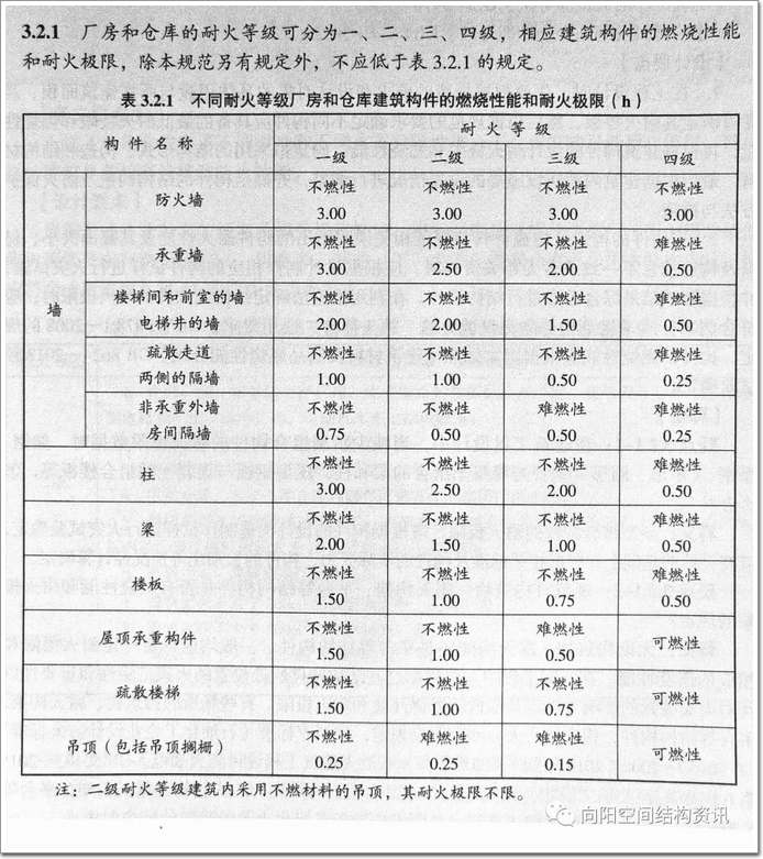 《建筑設(shè)計防火規(guī)范》GB 50016 中,表3.2.1為廠房和倉庫不同的耐火等級所對應(yīng)的建筑構(gòu)件的燃燒性能和耐火極限。