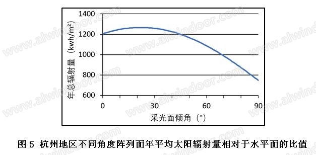 3)綜合效率系數(shù)與很多參數(shù)有關(guān),一般通過(guò)專業(yè)軟件計(jì)算,在發(fā)電量估算時(shí),光伏方陣傾角之外的系數(shù)可以按照80%-82%取值。因?yàn)楣夥粔嵌茸兓^大,光伏方陣傾角系數(shù)需單獨(dú)考慮。以浙江地區(qū)為例,從圖5可以粗估,90°立面的幕墻損失量大概在40%左右。也可以通過(guò)Perez模型、HDKR模型或者Hay模型計(jì)算傾斜面太陽(yáng)輻射量。