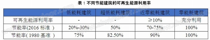 零能耗建筑是近零能耗建筑的高級(jí)表現(xiàn)形式,其定義中明確說(shuō)明可再生能源產(chǎn)能需大于等于建筑自身的用能。以中國(guó)北方建筑為例,不同節(jié)能建筑的可再生能源利用率,見表1。