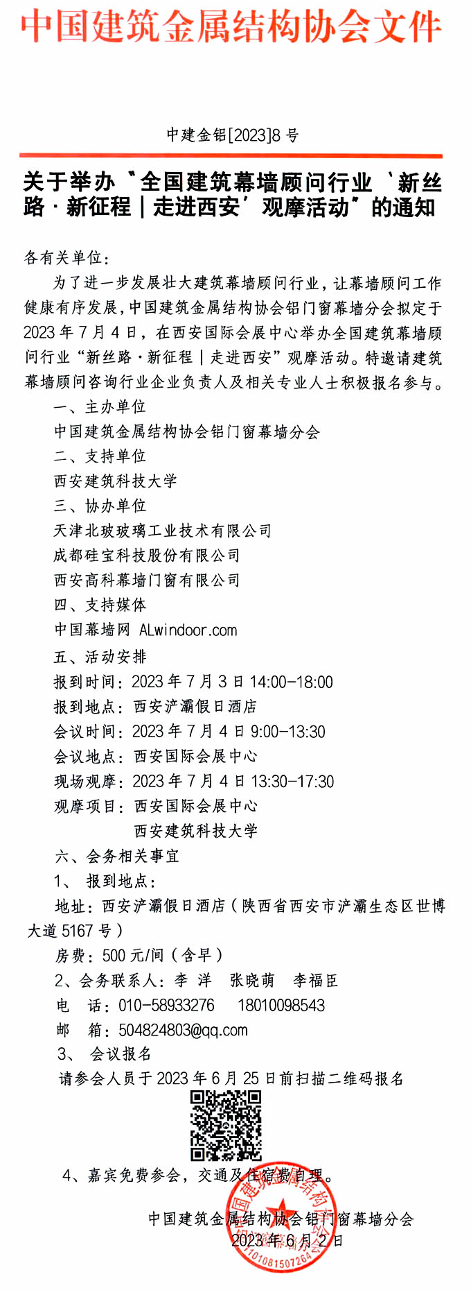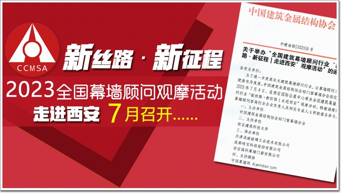 為了進一步發展壯大建筑幕墻顧問行業,讓幕墻顧問工作健康有序發展,中國建筑金屬結構協會鋁門窗(詞條“門窗”由行業大百科提供)幕墻分會擬定于2023年7月4日,在西安國際會展中心舉辦全國建筑幕墻顧問行業“新絲路·新征程|走進西安”觀摩活動。特邀請建筑幕墻顧問咨詢行業企業負責人及相關專業人士積極報名參與。