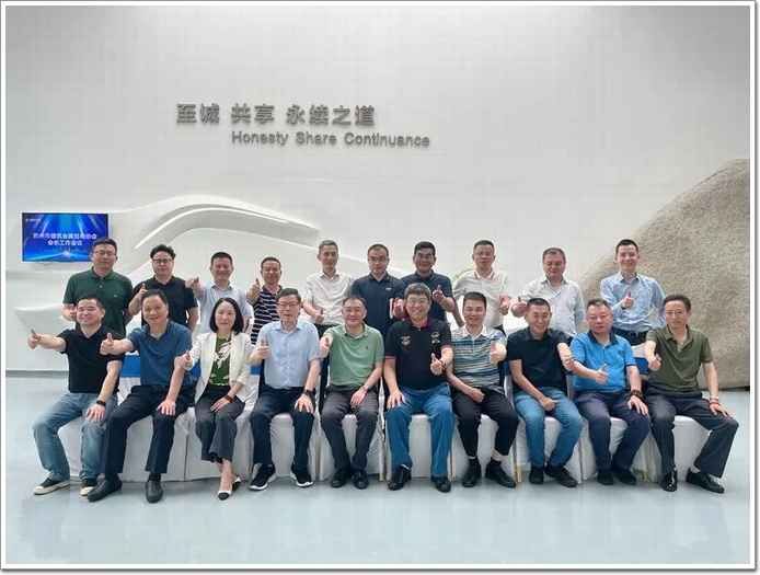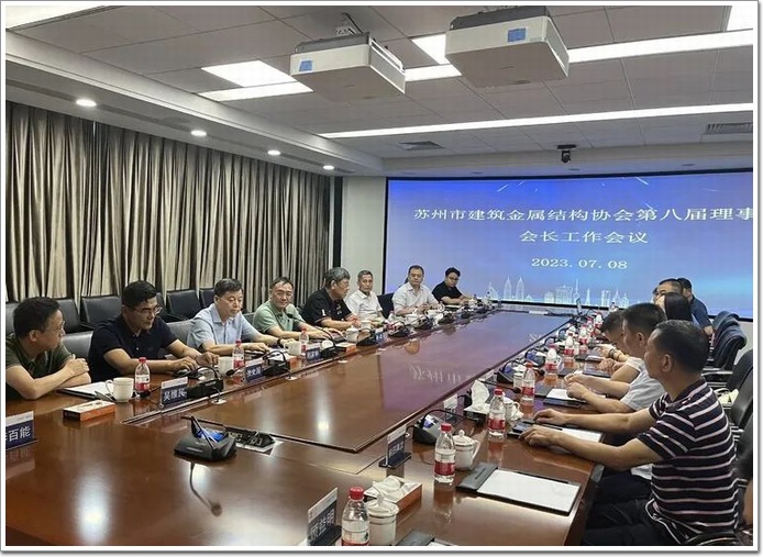 2023年7月8日下午,蘇州市建筑金屬(詞條“金屬”由行業大百科提供)結構協會第八屆理事會會長工作會議召開,各會長單位董事長、總經理及高管代表,以及協會總顧問、監事長、秘書長、協會專業委員會主任等,冒著大雨,悉數來到會議所在地:蘇州蘇明裝飾股份有限公司。