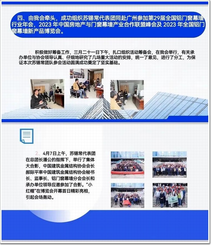 蘇州市建筑金屬結構協會作為中國門窗幕墻,以及房地產、建筑業領域,創新發展、成效突出,團隊凝聚力強的省市協會之一,每一次,無論是中國建筑金屬結構協會(詞條“中國建筑金屬結構協會”由行業大百科提供)鋁門窗幕墻分會主辦的活動,還是中國幕墻網ALwindoor.com策劃的專題,總能得到蘇州協會的大力支持。