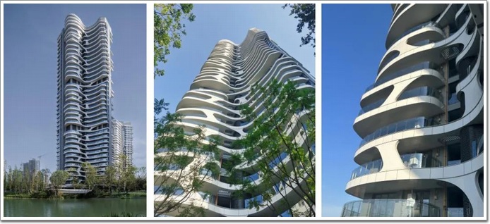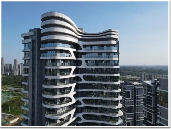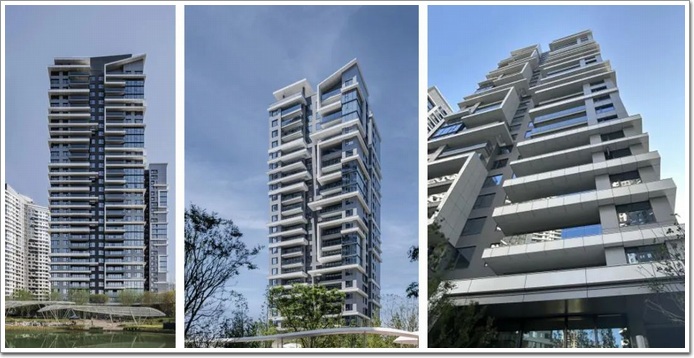 以4棟為例,彎曲形直板、延伸的陽臺(tái)和飄板在建筑立面有機(jī)結(jié)合,形成了富有韻味的流動(dòng)感。遠(yuǎn)望如麓湖在空間上的縱向延伸,樓與水相接;近看可見錯(cuò)落有致的空間細(xì)節(jié),移步換景,令人贊嘆。