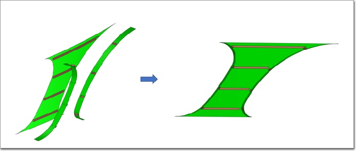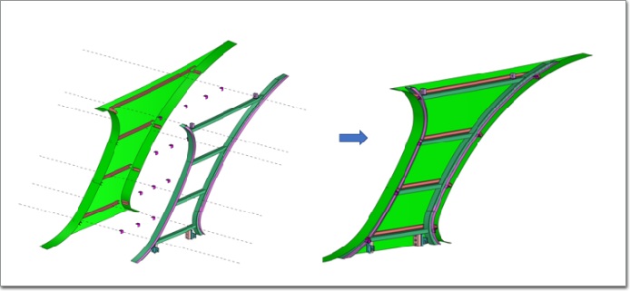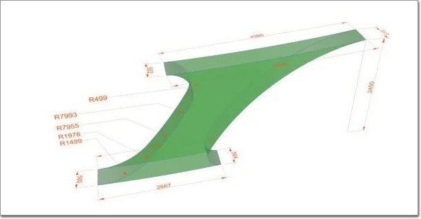 首先進(jìn)行面板的加工制作。通過肋板對(duì)弧形面板進(jìn)行找形,控制面板回彈,并布置加強(qiáng)筋保證面板強(qiáng)度。接下來,在正面與側(cè)面弧板單獨(dú)加工成型后,焊接成整體,焊縫打磨后氟碳噴涂。