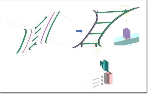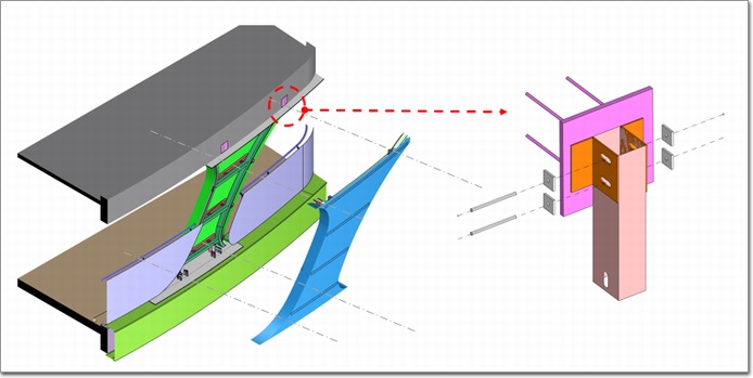 隨后進(jìn)行造型骨架的組裝,將鋼管焊接成與外表皮相匹配的造型骨架,再將面板與造型骨架之間通過螺栓進(jìn)行連接,至此即完成了一個(gè)整體裝配式單元的拼裝。