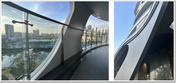 施工進(jìn)場(chǎng)后為了保證最終的落地性效果,經(jīng)過多次研討,從收口細(xì)節(jié)、加工精度、成型效果等各方向進(jìn)行了推敲,調(diào)整欄桿立柱倒角、上下口增加立邊消化誤差、將厚重的塊體減薄到欄桿立柱外,使整個(gè)造型更加輕盈,陽臺(tái)空間更為寬敞。