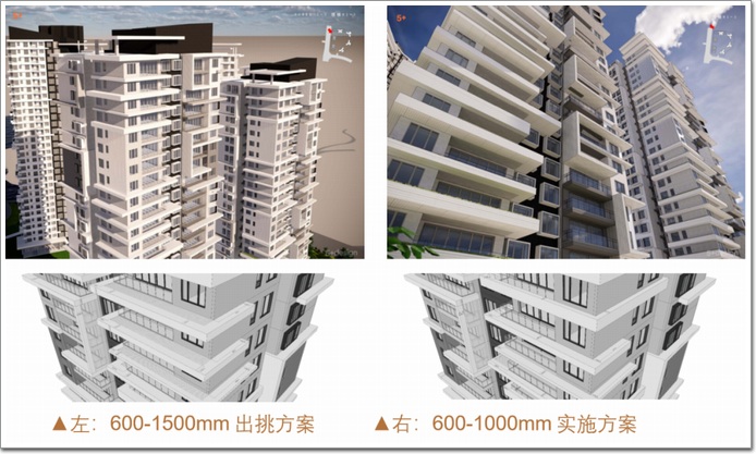 原方案擬采用較大高低進(jìn)退的出挑線條,勾勒建筑層疊的穿插造型,在外裝深化設(shè)計(jì)過程中 ,線條造型的出挑長(zhǎng)度及防流掛作為研究的重點(diǎn),結(jié)合方案效果,經(jīng)過反復(fù)論證與考量,對(duì)外挑尺寸進(jìn)行規(guī)整,分析合理距離出挑長(zhǎng)度, 實(shí)現(xiàn)效果與安全性的平衡。