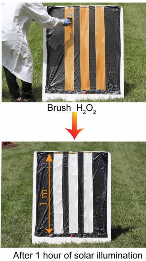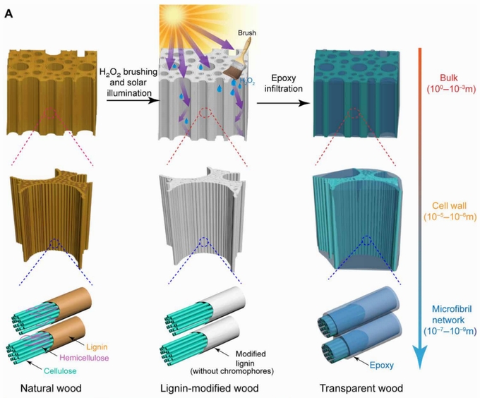 這個(gè)方法的發(fā)明者是來自馬里蘭大學(xué)材料科學(xué)與工程學(xué)院胡良兵教授團(tuán)隊(duì)的夏芹芹和陳朝吉,在把一塊1m長、1mm厚的巴沙木板做成透明木板的具體操作中,他們先在木板表面刷一遍雙氧水,然后將其暴露在紫外線燈光(或陽光)下一小時(shí),這時(shí)雙氧水會(huì)漂白掉木質(zhì)素的發(fā)色基團(tuán),只保留木質(zhì)素的芳香族骨架。
