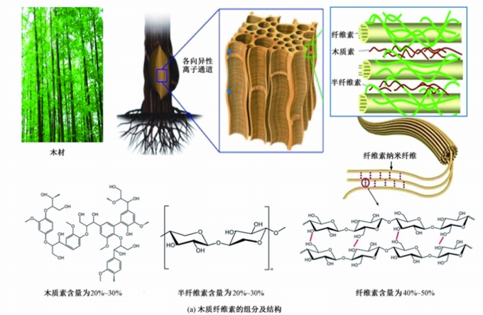 其中纖維素是木材的強(qiáng)度支架,它沿著樹生長的方向高度有序地排列著,而半纖維素和木質(zhì)素作為小分子和粘合劑,通過氫鍵和共價(jià)鍵與纖維素交織成了承力網(wǎng)絡(luò),形成了保護(hù)植物細(xì)胞的天然抗降解屏障。
