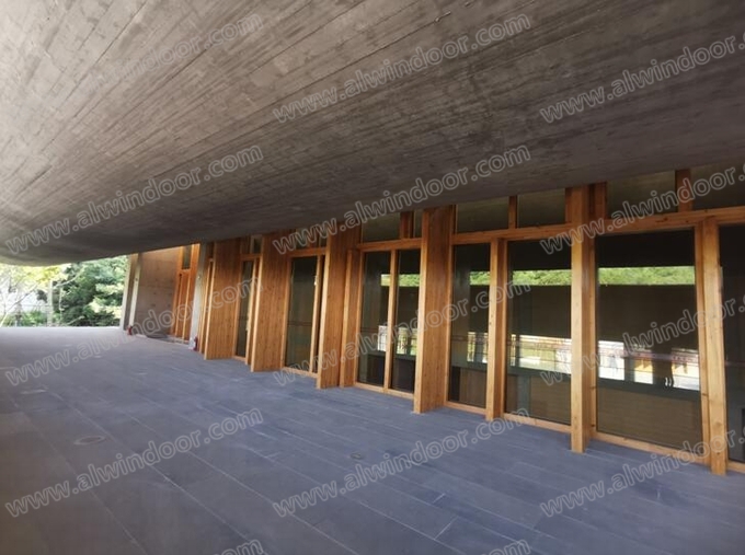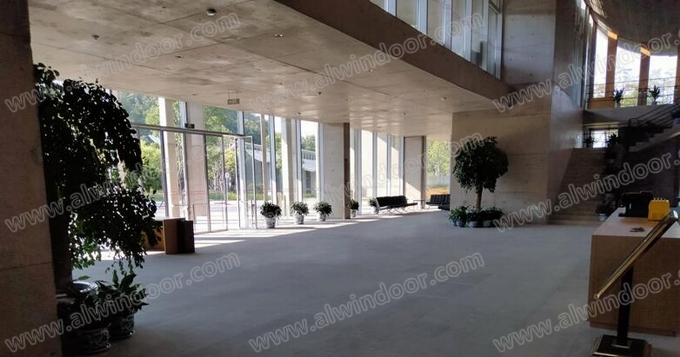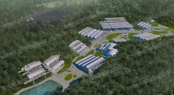 鋁合金玻璃窗主要布置在會議廳凹型屋面交接處,兼做采光(詞條“采光”由行業大百科提供)和排煙使用。鋁合金窗采用65系列斷橋鋁合金(詞條“斷橋鋁合金”由行業大百科提供)型材,面材采用6(low-e)+12A+6鋼化中空low-e雙銀玻璃。整體配消防聯動鏈條式電動推桿。