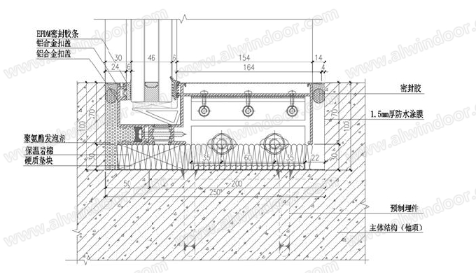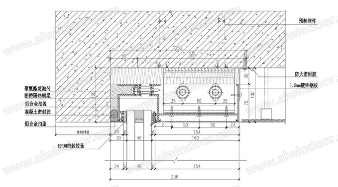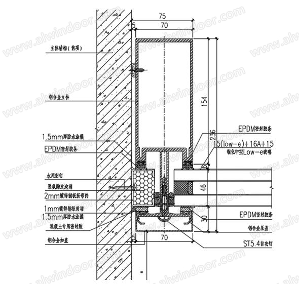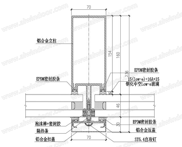 本系統采用70mm明框形式;玻璃采用15(low-e)+16A+15鋼化中空(詞條“中空”由行業大百科提供)low-e雙銀玻璃或采用10(low-e)+16Ar+10鋼化中空low-e雙銀玻璃。幕墻橫豎龍骨均采用鋁合金龍骨(詞條“鋁合金龍骨”由行業大百科提供),材質6063-T6,室外室內側均為原色陽極氧化。幕墻上下兩根橫框隱藏在混凝土樓板的預制凹槽中,達到視覺無框效果。