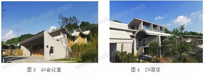本工程外圍護結構是由一體澆筑成型的裝飾型混凝土墻面及屋頂、鋁(詞條“鋁”由行業大百科提供)合金(詞條“合金”由行業大百科提供)金屬框架玻璃幕墻、木龍骨框架玻璃幕墻和鋁合金玻璃窗組成。