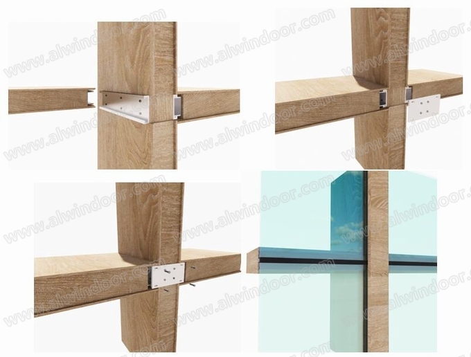 本系統面材采用:15(low-e)+16A+15鋼化中空low-e雙銀玻璃、采用10(low-e)+16A+10鋼化中空low-e雙銀玻璃和雙面實木組合面板。幕墻橫豎龍骨均采用膠合木龍骨。木材原材為樟子松,龍骨表面木原色并進行防腐、防蛀、防火處理。木材與連接件、木材與混凝土結構之間均采用構造防水,避免積水腐蝕。